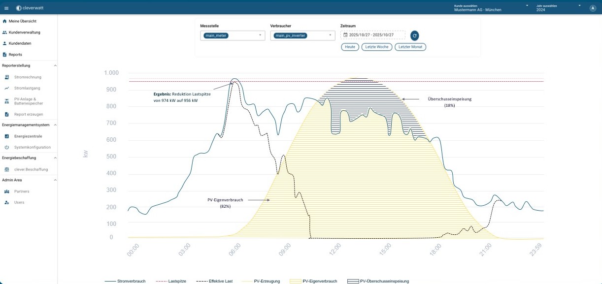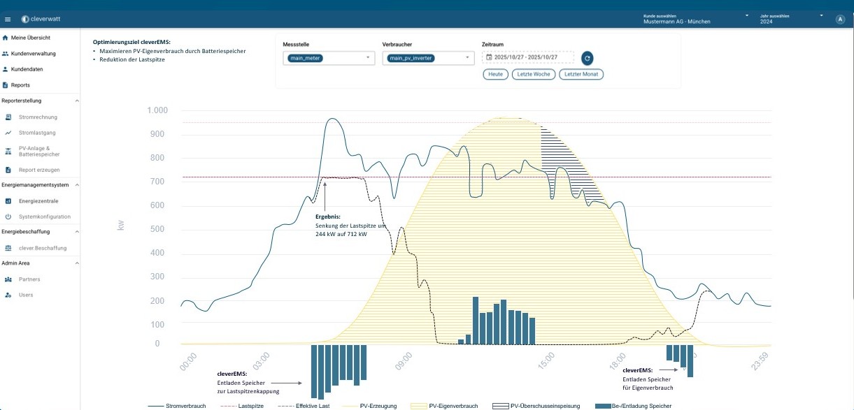 Im gezeigten Beispiel konnte eine morgendliche Lastspitze zwischen 6:00 und 7:30 Uhr von 712 kW um 244 kW reduziert werden. Der Speicher wird anschließend während der PV-Erzeugung erneut geladen und steht später wieder zur Verfügung. Der Speicher erfüllt damit mehrere Funktionen innerhalb eines Tages.