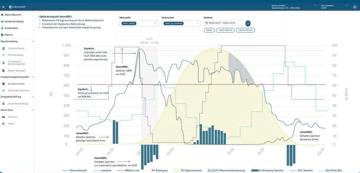 In der Abbildung ist erkennbar, dass der Speicher bei niedrigen Spotpreisen lädt und sowohl in Hochpreisphasen als auch während der Hochlastzeitfenster entlädt. Wichtig ist dabei die Priorisierung: Spotmarkt-Optimierung erfolgt nachrangig, wenn sie nicht mit Peak-Shaving- oder HLZF-Zielen kollidiert.